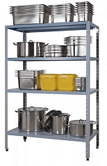 Стеллаж укомплектован полками (4 шт.) с дополнительным усилением, а так же двумя комплектами уголков усиления, комплектом опорных подпятников и регулируемых опор.