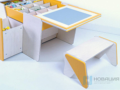 В центре столешницы расположены 4 квадратных платформы для Лего строительства, в каждом из четырех углов - ячейки для хранения деталей. Одновременно за столом могут заниматься до 4-х детей.