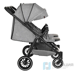 Материал ткани пропускает воздух. От солнца и ветра спальное место (L 760 мм) накрывается капюшоном со смотровым окном. Спинка двигается, принимает горизонтальное положение. Ремни безопасности крепятся к коляске в 5-ти точках. Мягкие накладки защищают кожу ребенка от натирания. Предусмотрен разделитель для ног.