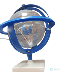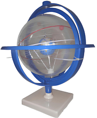 Макет с компасом вращается вокруг оси, повторяя вращение небесного свода. Углы наклона изменяются. Основные точки и линии, по отношению к которым производятся астрономические измерения, нанесены на поверхность модели.
