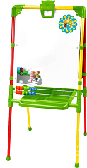 Угол наклона фиксируется стопорной планкой. Подвижные элементы мольберта можно легко регулировать для удобства отдельного ученика. В нижней части планшета прикреплена полка для канцелярских принадлежностей и для установки картона.